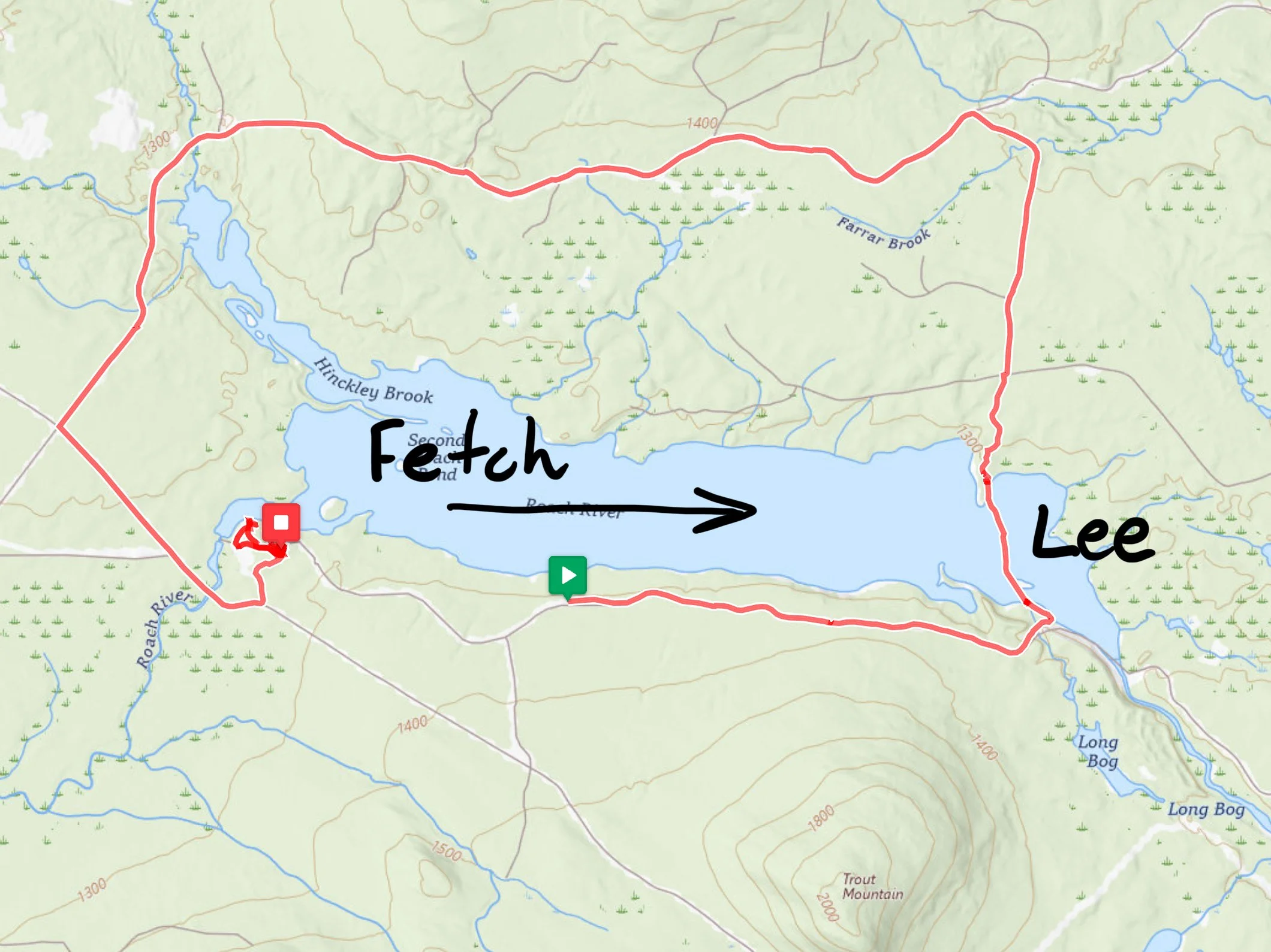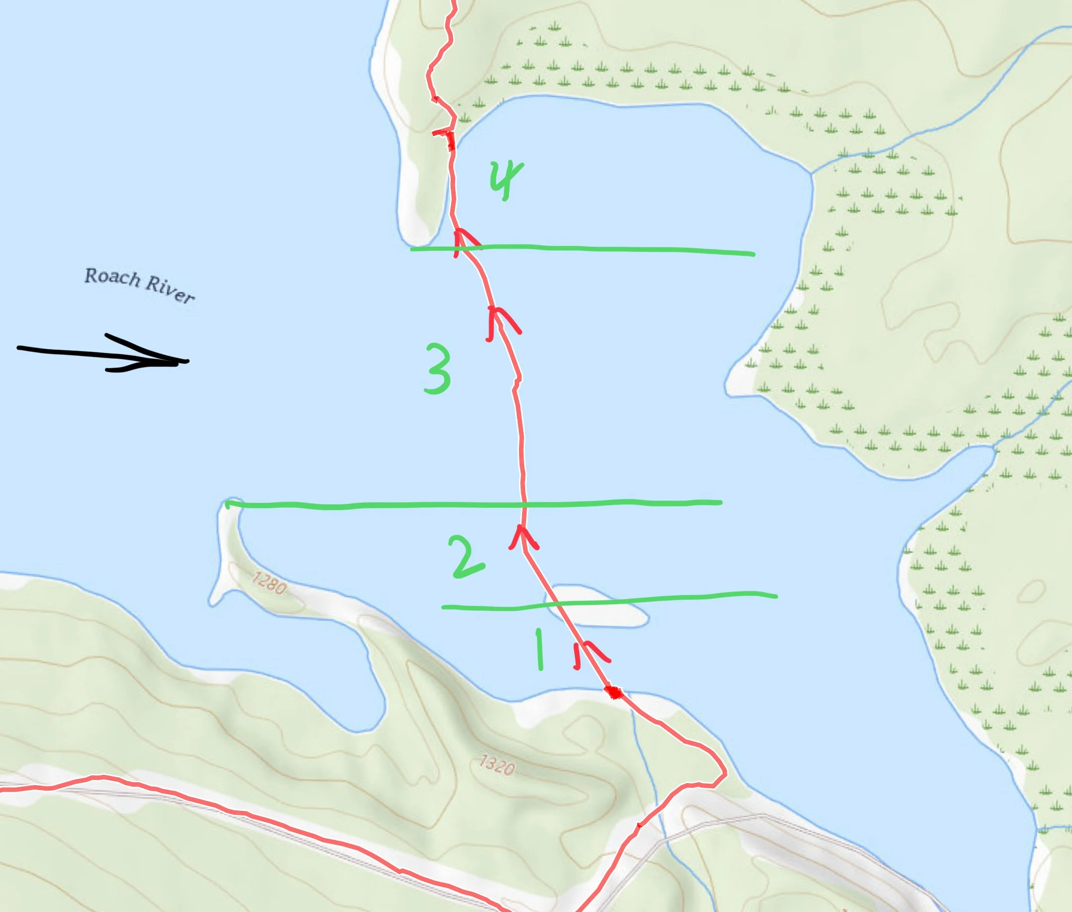Fetch- Since our crossing was on the East end of the pond and the wind was traveling the length of the pond (about 2 miles) before it reached us there was considerable fetch, this meant we were likely to see more waves than were on the West side. This isn’t great, but based on the waves we saw when we got ther, it was still a safe crossing.